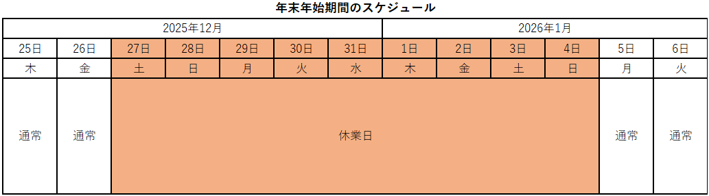 当社は、2025年12月27日(土)から、2026年1月4日(日)までを年末年始の休業日とさせていただきます。