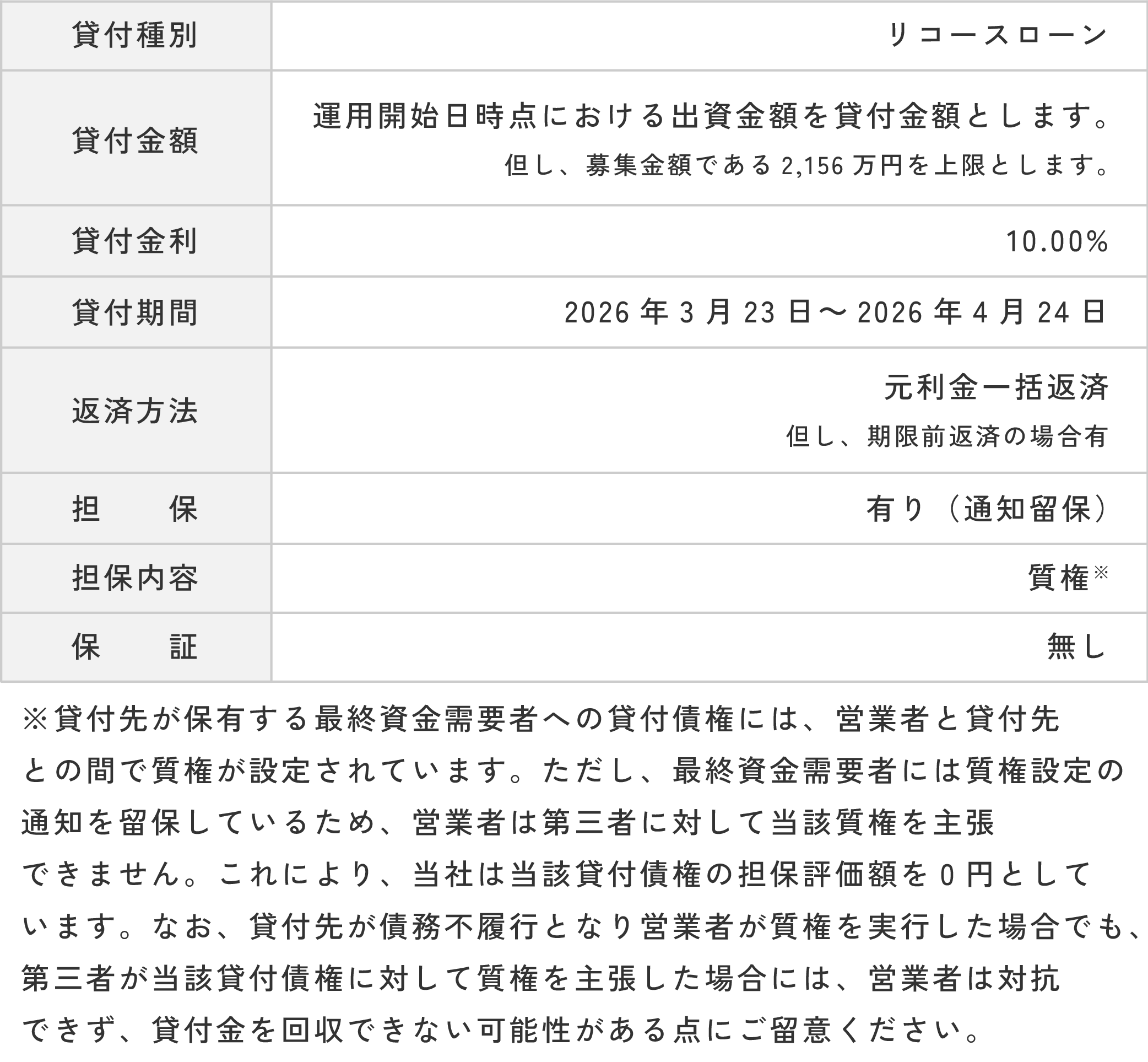 本件貸付にかかる営業者と貸付先の貸付期間は2026年3月23日から2026年4月24日となっております。