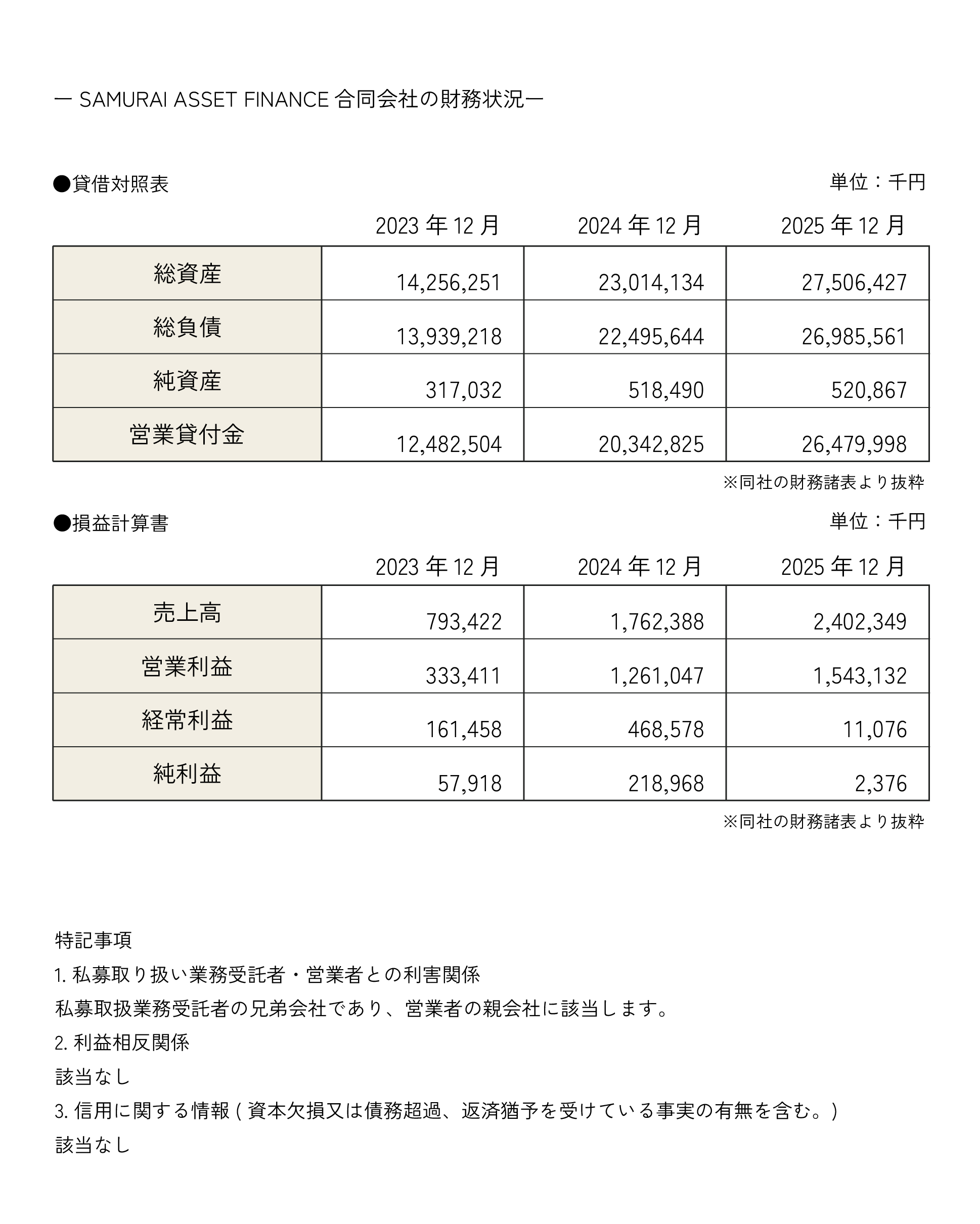 貸付先(運営者)の経理業務・管理事務全般の効率化、また、運営者が為替変動リスクを負担し、さらに、最終資金需要者の信用が悪化した場合でも回収リスクを逓減できるため、営業者の貸付先としてグループ会社(営業者の親会社であるSAMURAI ASSET FINANCE合同会社)を介在させております。