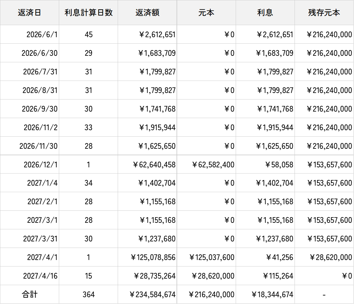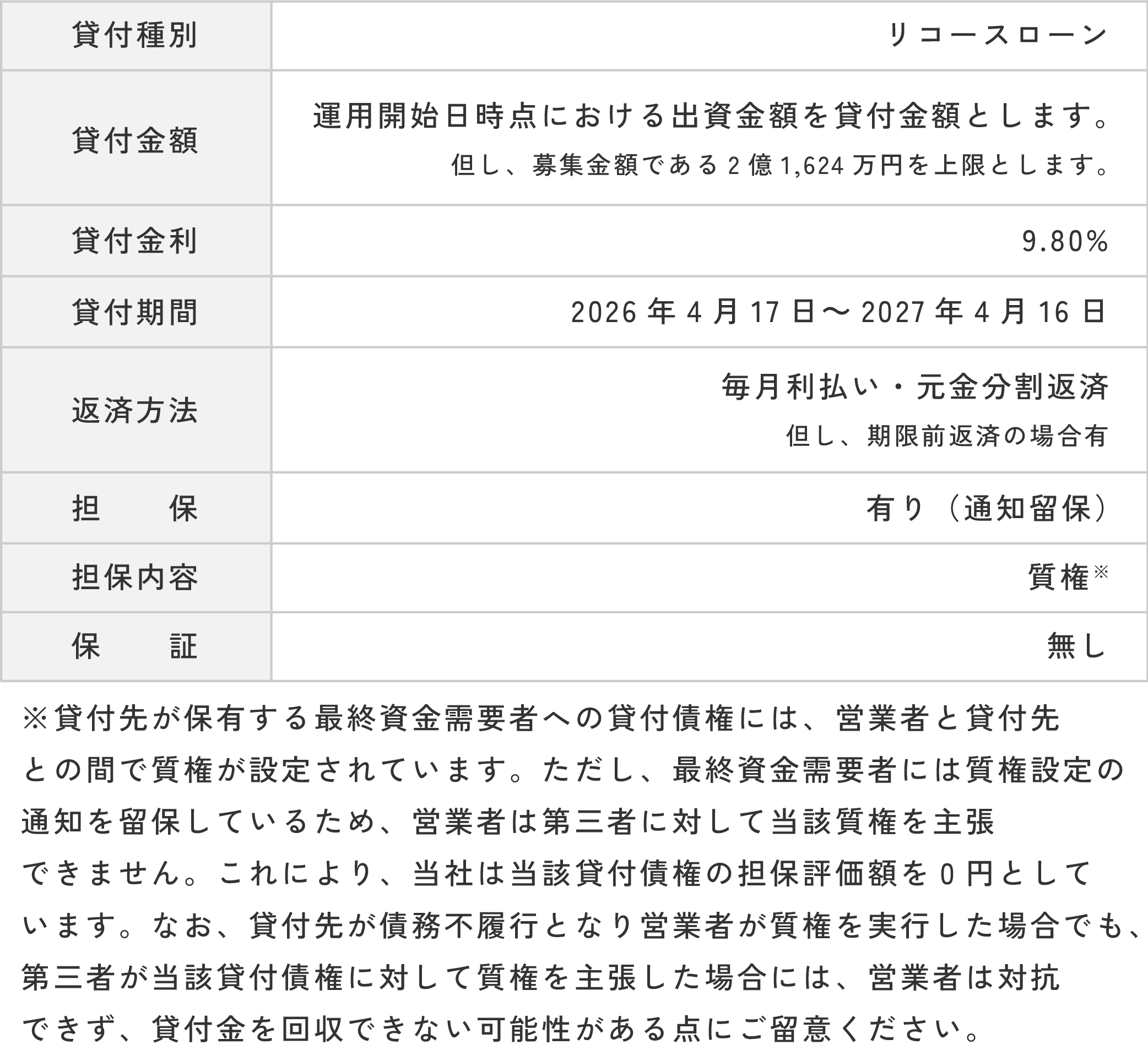 本件貸付にかかる営業者と貸付先の貸付期間は2026年4月17日から2027年4月16日となっております。