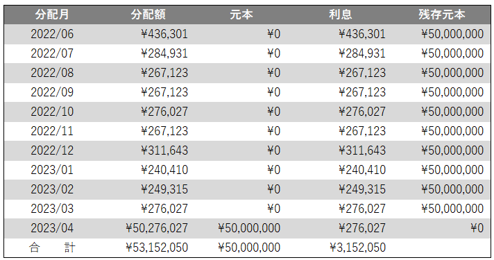 今回の資金使途は事業資金の貸付資金となります。 本件貸付にかかる営業者と貸付先の貸付期間は2022年5月12日から2023年5月1日となっております。貸付先から営業者への返済については自己資金又は借換資金を予定しております。分配予定表は下記となります。
