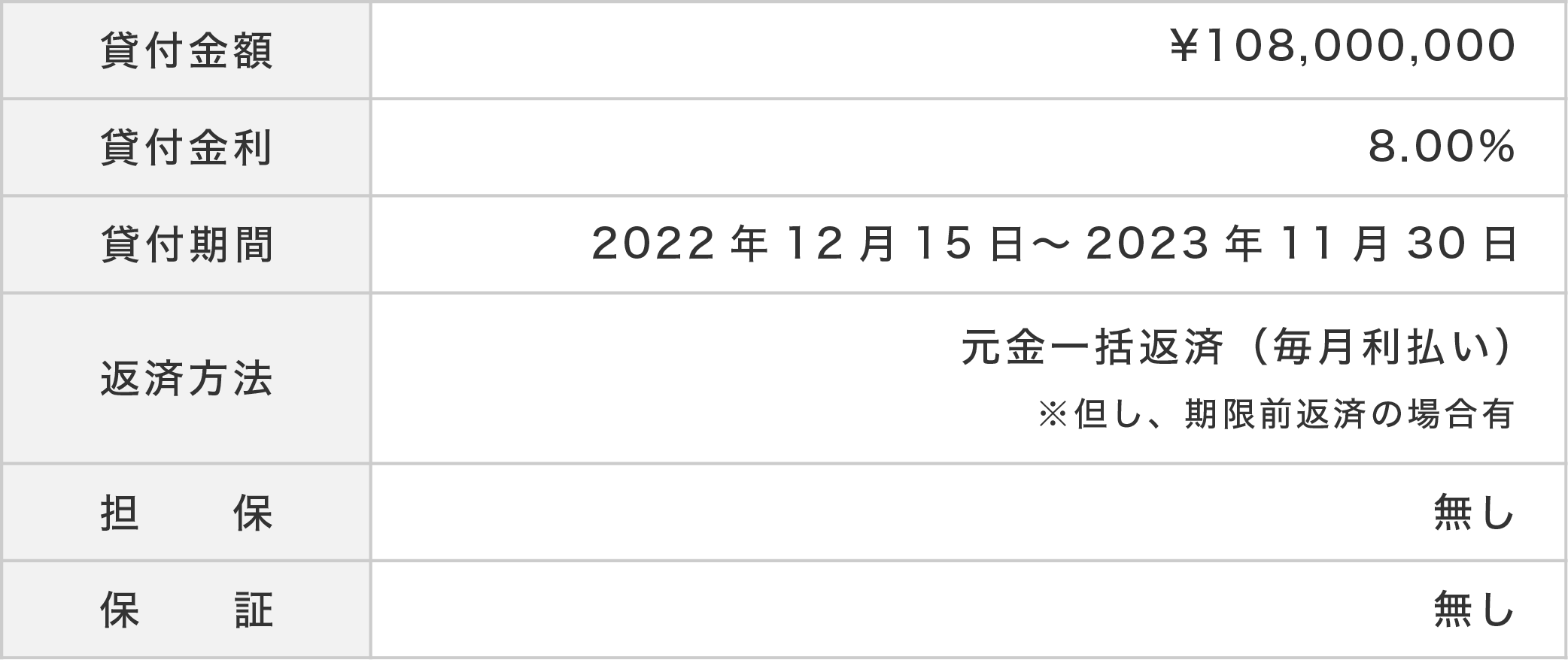 本件貸付にかかる営業者と貸付先の貸付期間は2022年12月15日から2023年11月30日となっております。