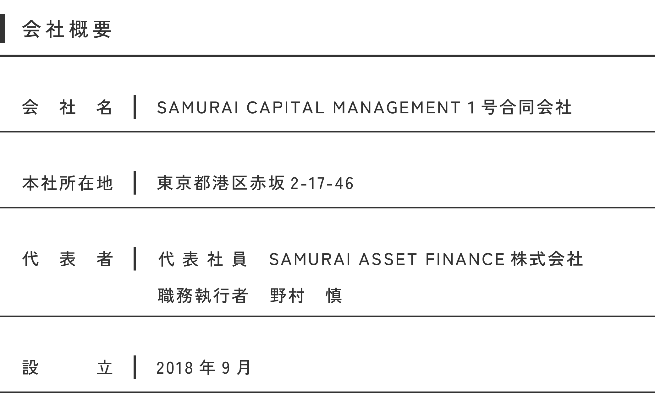 本匿名組合は、SAMURAI CAPITAL MANAGEMENT1号合同会社(以下、「営業者」といいます。)がSAMURAI ASSET FINANCE株式会社(以下、「貸付先」といいます。)に対して貸付(以下、「本件貸付」といいます。)を行う貸付型クラウドファンディングとなります。
