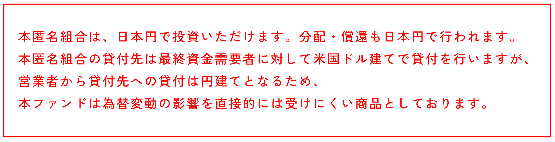 貸付先(運営者)の経理業務・管理事務全般の効率化、また、貸付先(運営者)が為替変動リスクを負担し、さらに、最終資金需要者の信用が悪化した場合でも回収リスクを逓減できるため、営業者の貸付先としてグループ会社(営業者の親会社であるSAMURAI ASSET FINANCE株式会社)を介在させております。