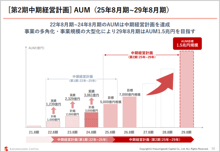 最終資金需要者が2024年10月2日付で公表した「第2期中期経営計画」においては、2029年8月期までにAUM1.5兆円の達成を目標として各事業を推進しております。2025年8月期第2四半期時点においては、同年度の通期目標を既に達成しており、計画はおおむね順調に進捗しております。