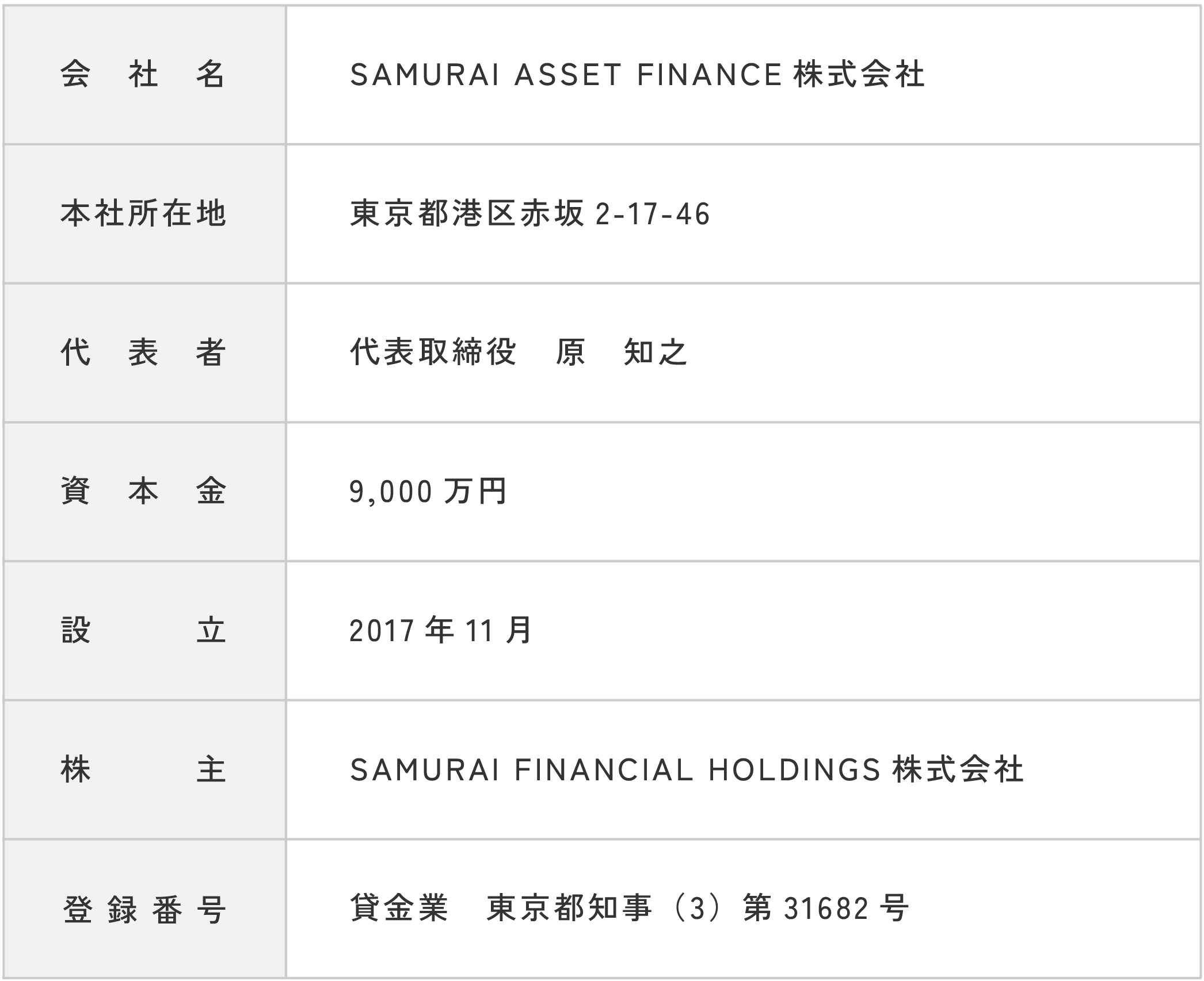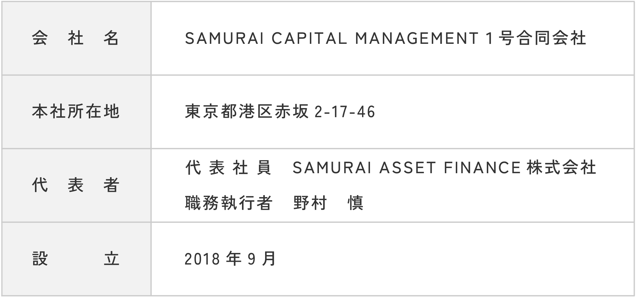本ファンドは、運営者で且つ貸付先でもあるSAMURAI ASSET FINANCE株式会社(以下、「貸付先」という。)の営む貸付事業に対し、SAMURAI CAPITAL MANAGEMENT1号合同会社(以下、「営業者」という。)が実施する貸付資金を募集するファンドとなります。