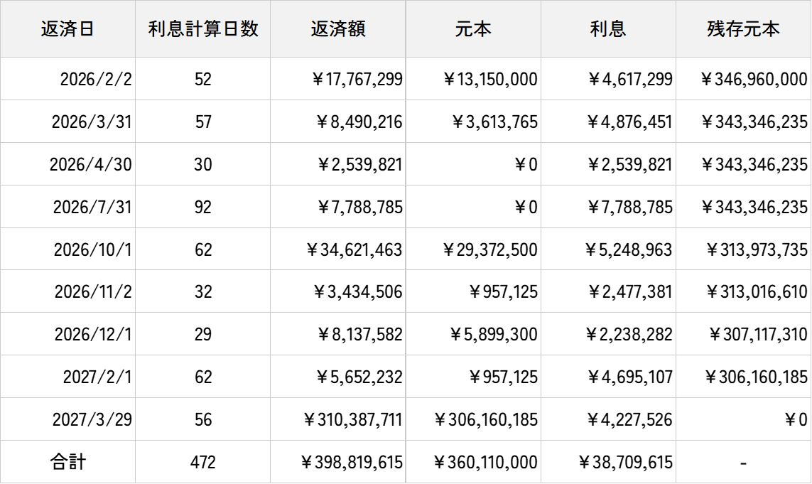 上記の事業計画表は出資金額が出資募集金額の総額に達した場合を想定したものとなります。したがって、本匿名組合における最終的な出資金額によっては、事業計画表にある通りの利息を得られない可能性があります。また、営業者が貸付先との契約条件に基づき作成した事業計画上の見込みであり、将来を保証するものではありません。実際の償還時期・金額は、貸付先による期限前弁済(繰上返済)や延滞等により、変更される可能性があります。