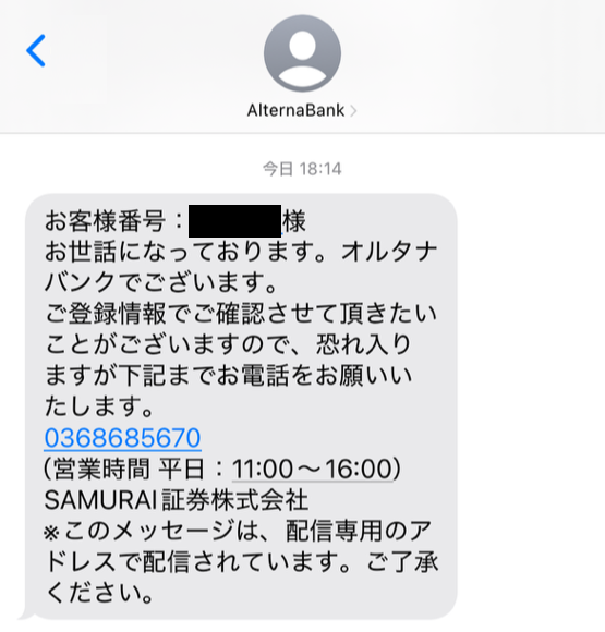 - 当社を装い、オルタナバンクを不正に詐称し送信元としてSMSが送付されてきた場合には、すぐに開封せず必ず当社へお問い合わせください。